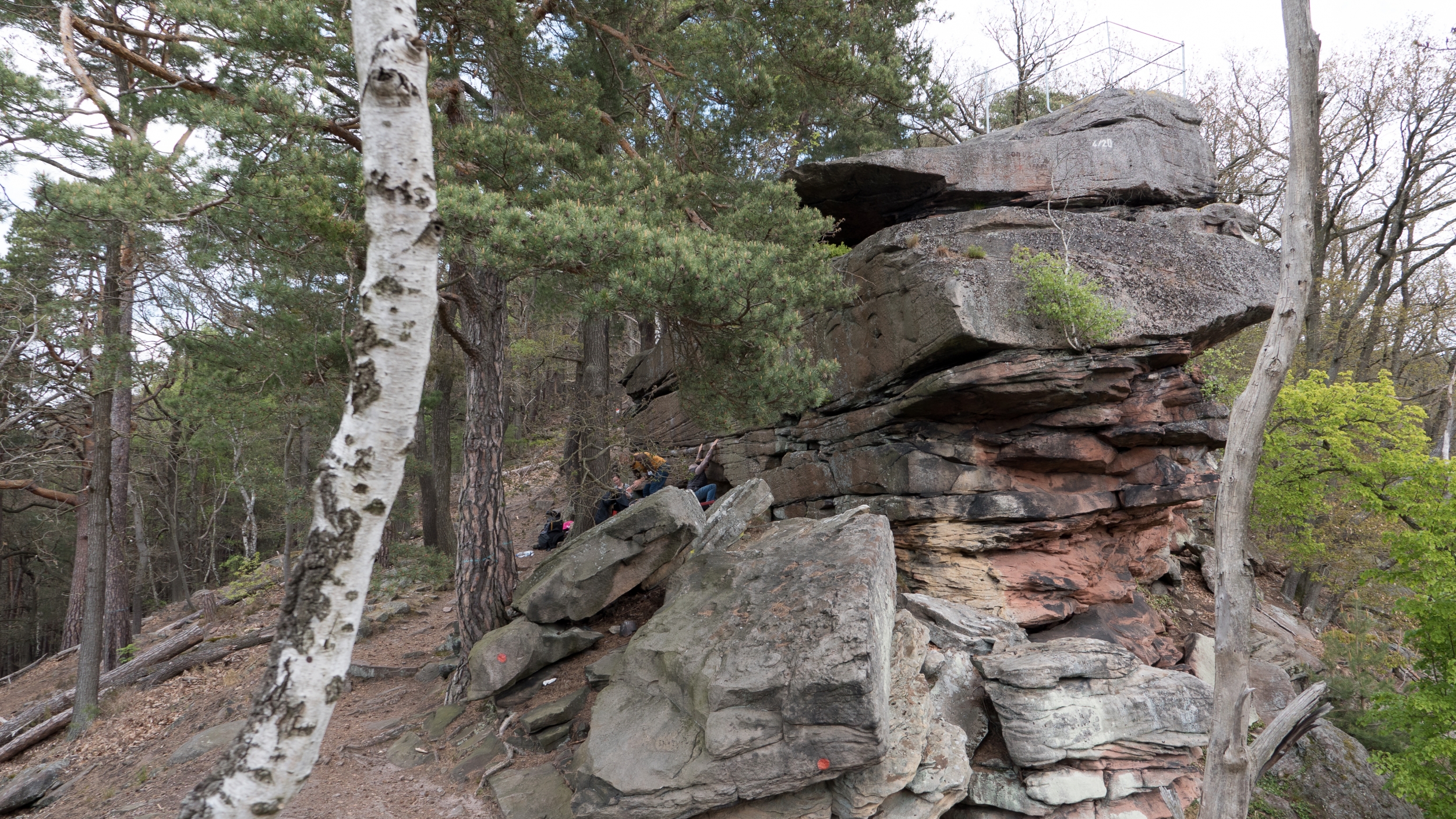 Ein Blick in den Sektor 2 weiter oben am Hang zeigte, dass hier mehr gebikt als gebouldert wird. Wir versuchten einige Boulder zu finden, putzen und zu klettern, aber es bestätigte sich mal wieder das, was manch Pfälzer Kletterer ungern hört: Sandstein ist der einzige Fels, der besser wird, je häufiger er beklettert wird. Wirklich lohnend (und auch beklettert) sah hier nur der Block Prisma aus. Da uns aber eher die Pizzeria lockte, wird dieser Block noch warten müssen ;-)
